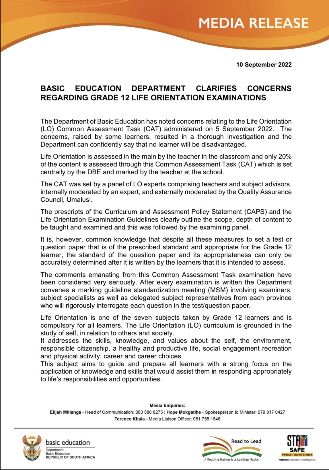 Dep Basic Education On Twitter Media Statement The Department Clarifies Concerns Regarding Grade 12 Life Orientation Examination Hubertmweli Elijahmhlanga Dbetvnews Reginahmhaule Https T Co Jk3ojzvubd Twitter
